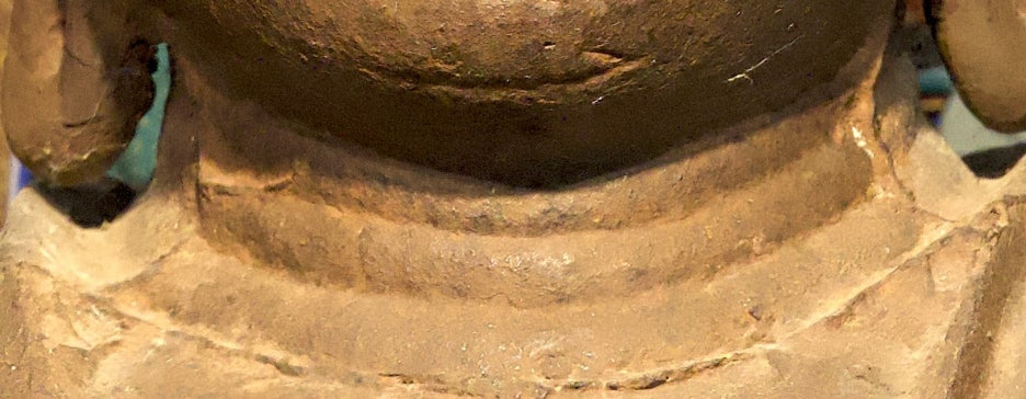 이중으로 표현된 턱 아래의 짧은 목에는 삼도가 뚜렷하게 새겨져 있다.