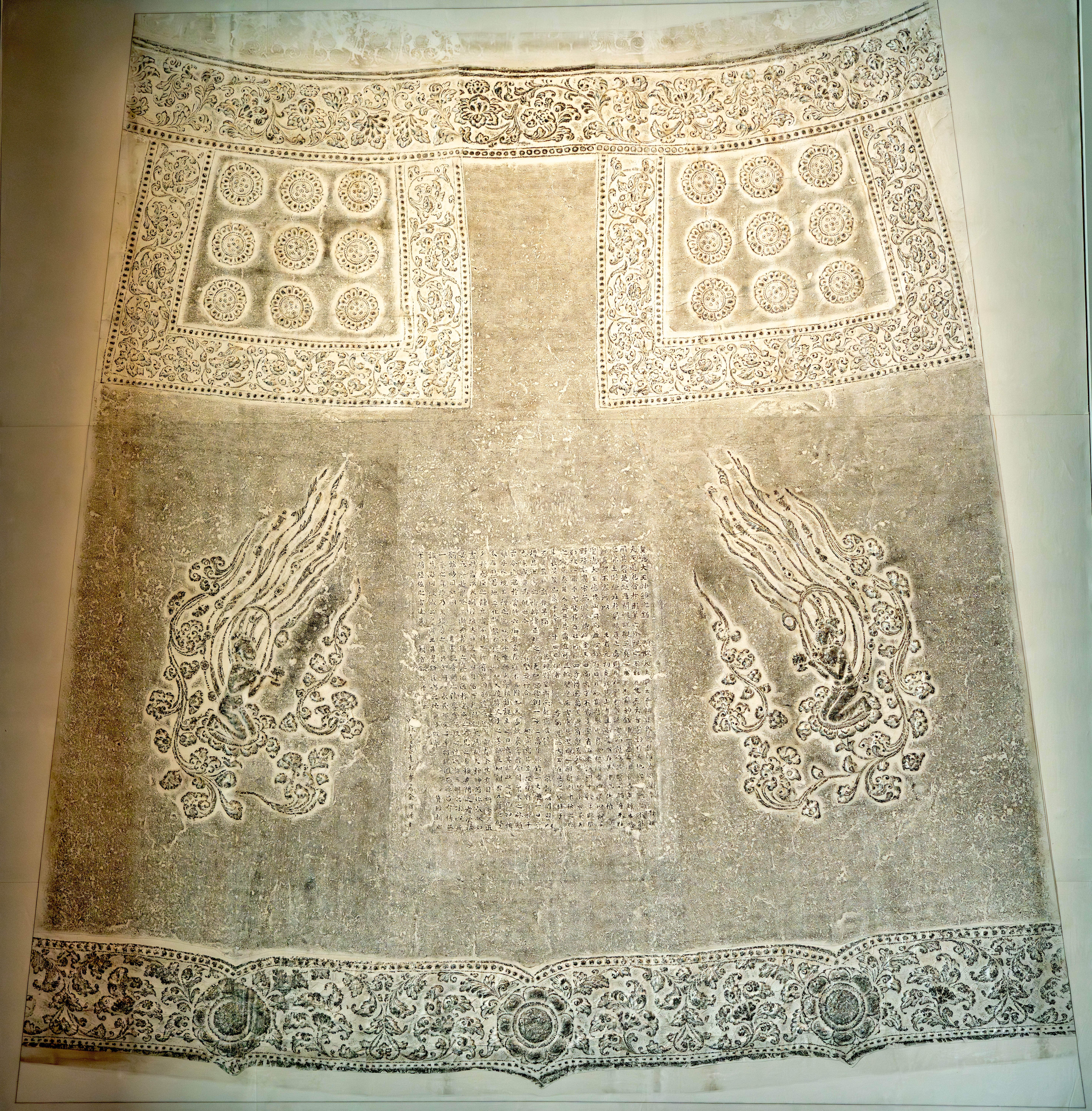 그 주위로 모란 당초문이 연기처럼 선각 되어 있다.