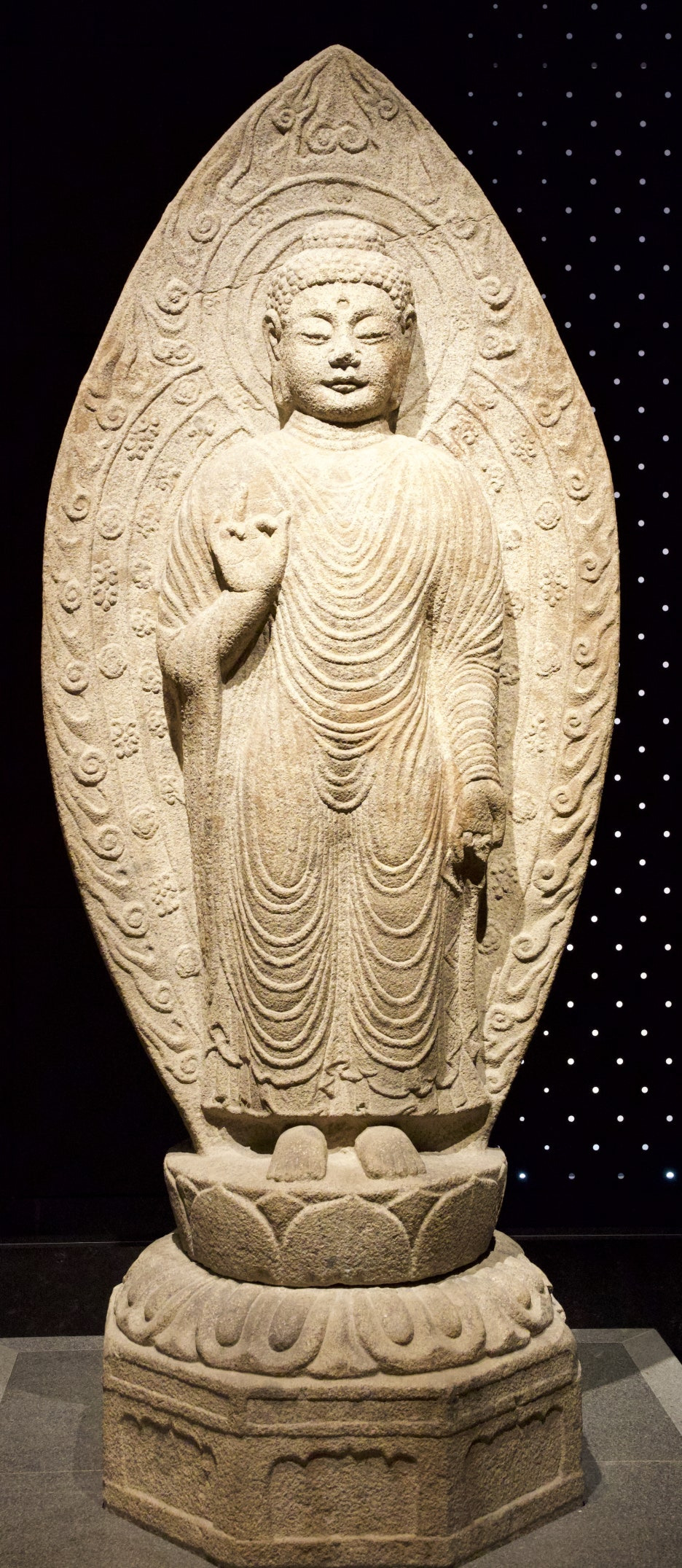 광배는 세 줄기의 융기선을 두르고 중앙에는 비운문, 외곽에는 화염문을 새겼다.