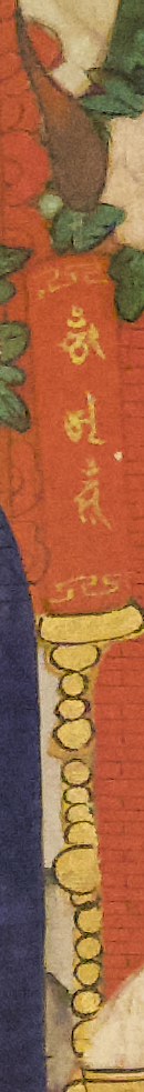감로단 앞 좌우에는 발이 4개가 있는 받침단이 있는데 좌측은 빨간 리본을 묶은 백자 화병, 우측은 녹색 리본이 묶인 붉은 화병에 모란이 꽂혀 있고 좌우에 승려가 있습니다.