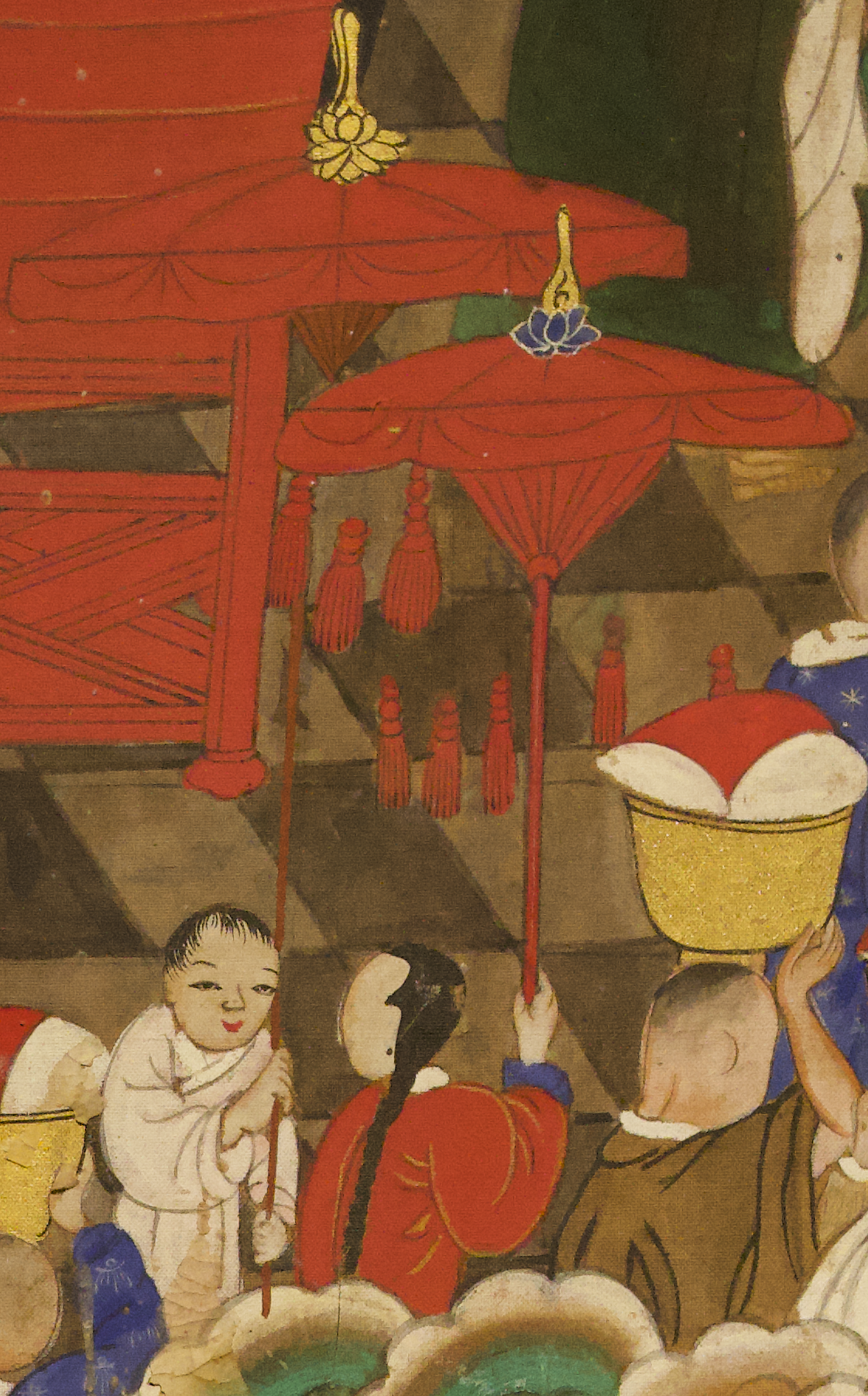 그 아래 공양을 머리에 이거나 들고 있는 승려는 두 줄로 서서 가고 있는데 앞줄에 댕기 머리 동자, 흰색 옷 입은 동자는 일산을 들고 대화하고 있고 법고 뒤에 나팔 부는 승려가 있습니다.