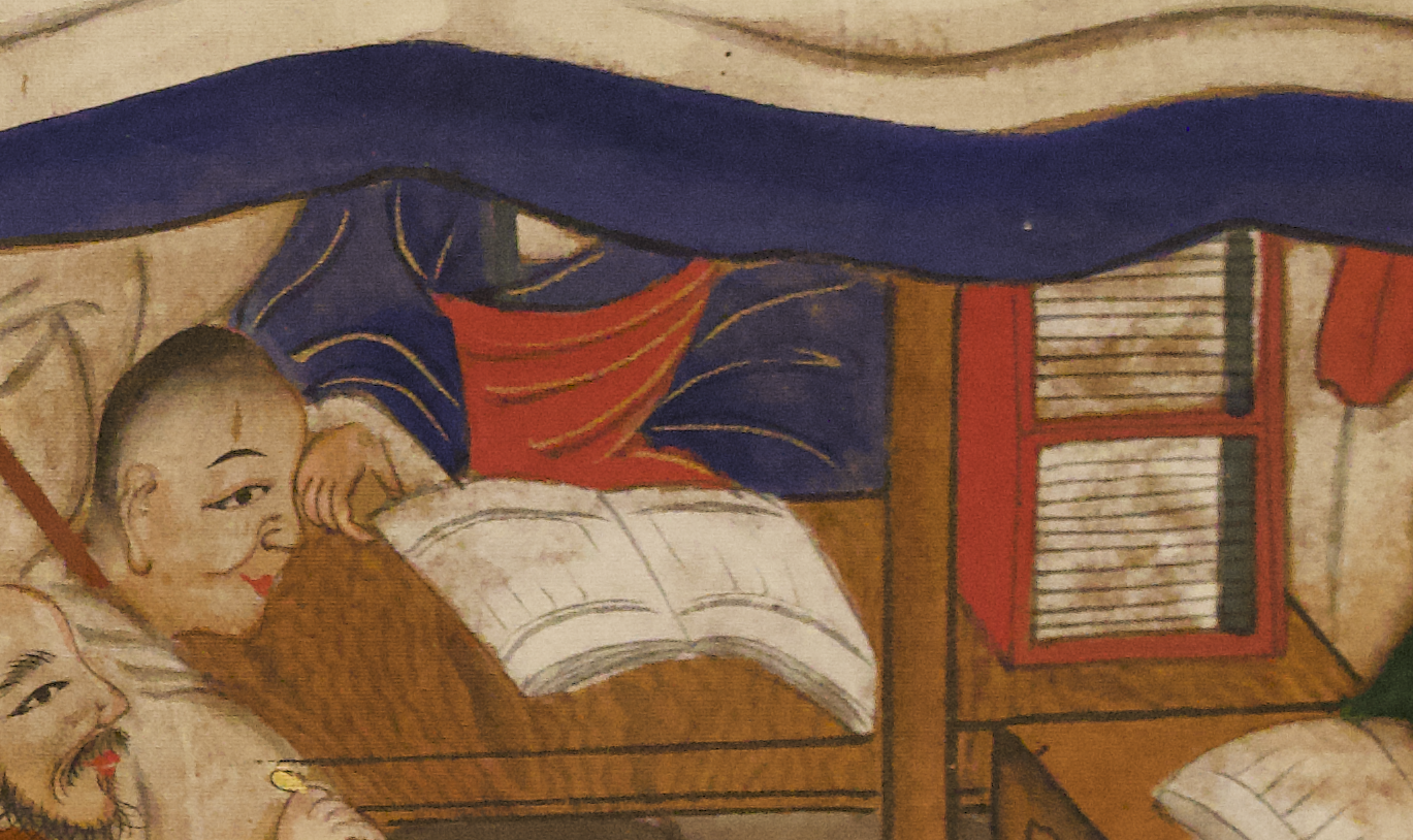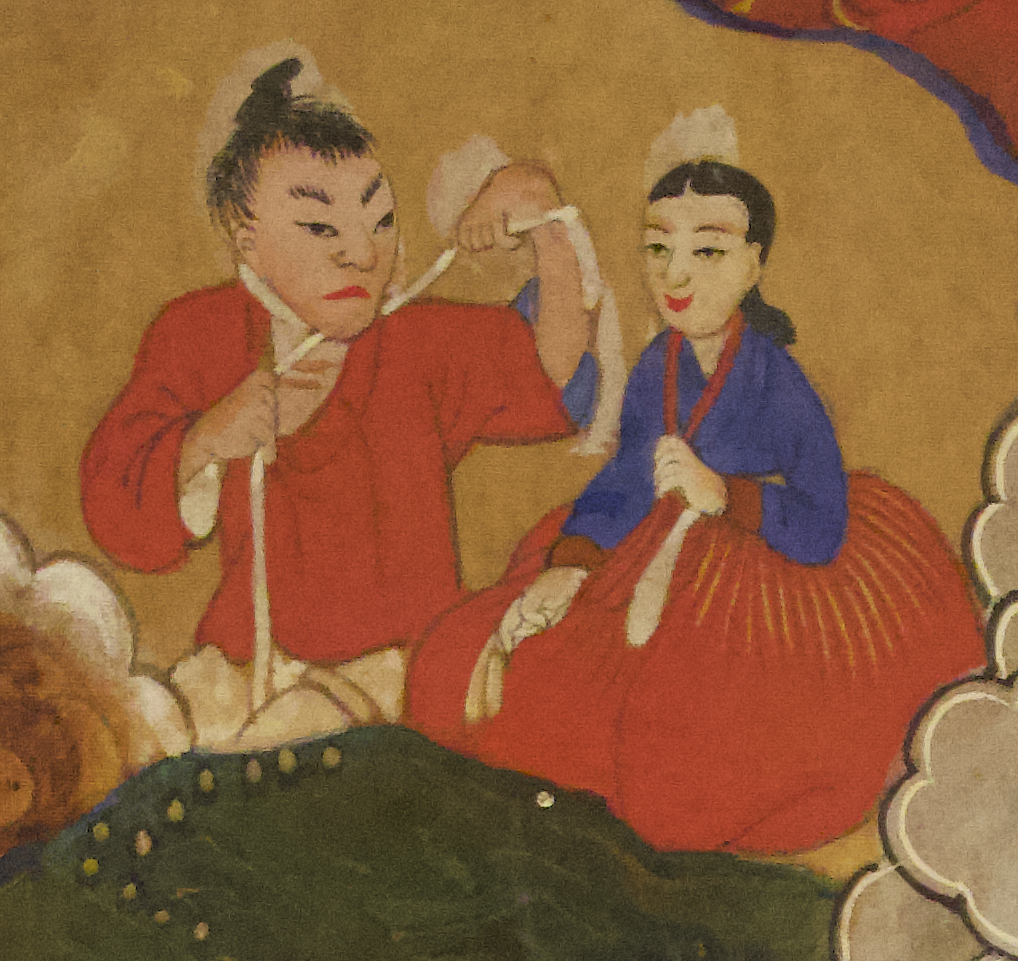 콧수염이 난 인물은 탕건을 쓰고 경을 보고 있고, 옆에 청색 관복 입은 벼슬아치가 의식을 구경하고 있습니다.