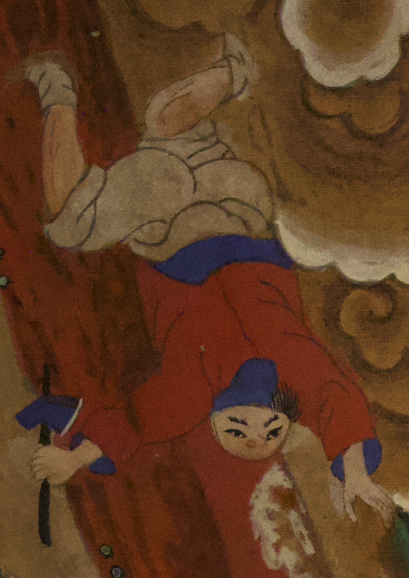 붉은 화병 옆엔 붉은 경상과 경책이 있는데 앉아 있는 승려는 붉은 석장을 쥐고 있고 옆에는 경쇠를 치고 있는 승려, 검지를 맞댄 수인을 하는 승려, 젊은 승려들이 서 있는데 수염을 통해서 나이를 유추할 수 있습니다.