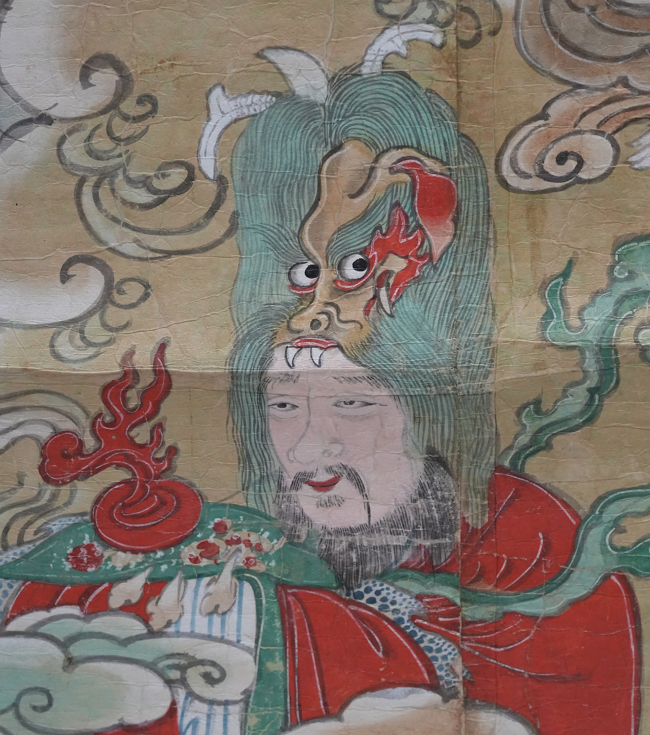 수염과 눈썹은 초록에 가까운 녹색으로 칠했으며 법의는 묽은 황색을 사용했고