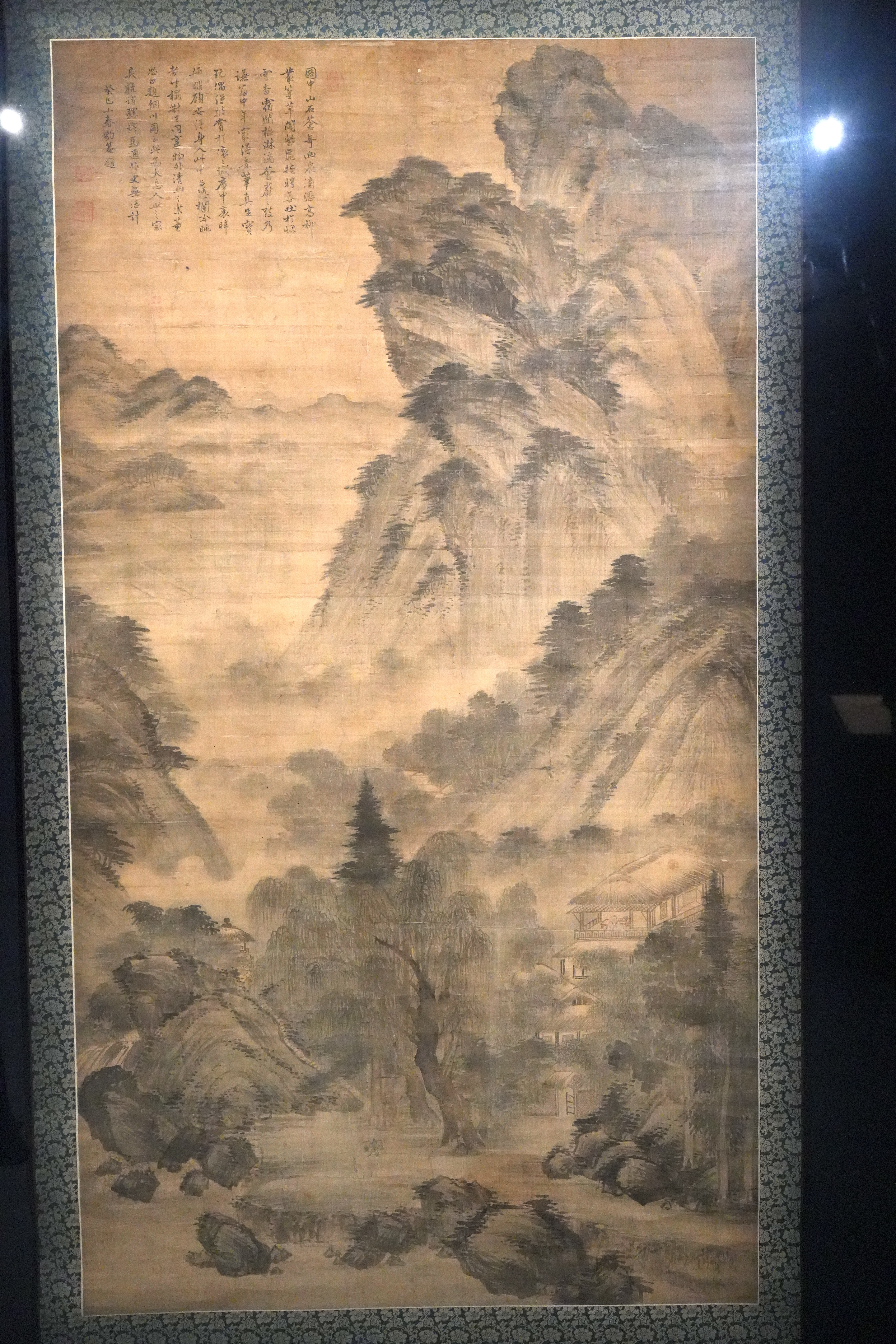 하단에는 빽빽한 수목 사이로 집이 한 채 있고, 먹을 중첩해 표현한 산들은 무겁고 육중한 느낌을 주는 동시에