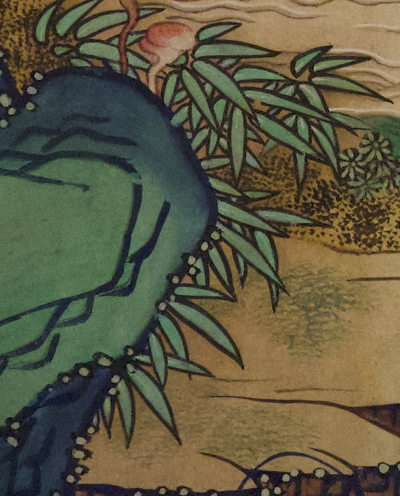 이 외에도 소나무의 윤곽선을 진한 먹선으로 표현하고 갈색으로 나타냈고 대나무를 구륵진채법으로 그렸다.