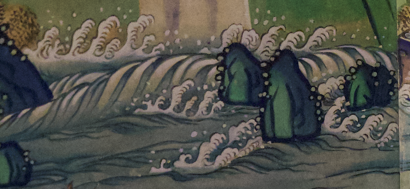 물결, 나무 등이 자연스럽게 연결되어 있지 않아 2첩 이상이 결실된 것으로 추정된다.