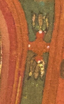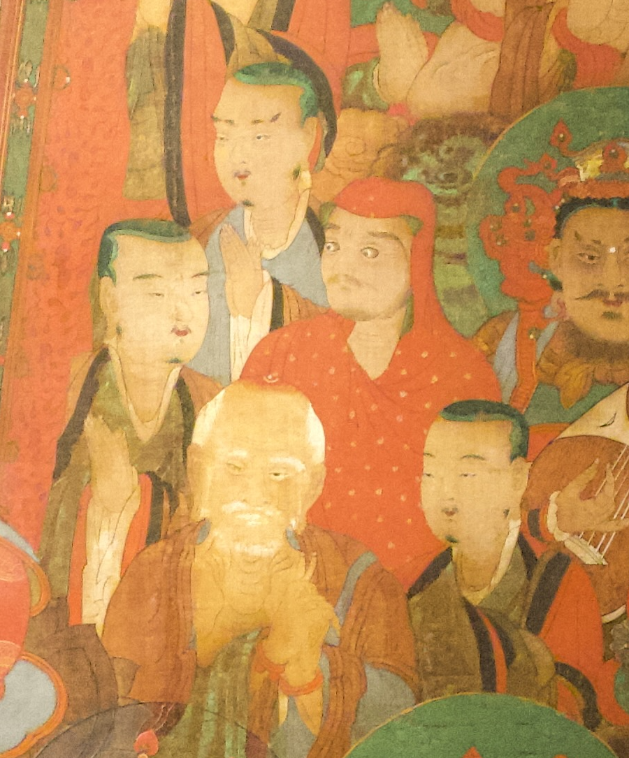 비록 뒷모습으로 묘사되었지만, 적색 가사와 군청색 장삼을 착용하고 있으며