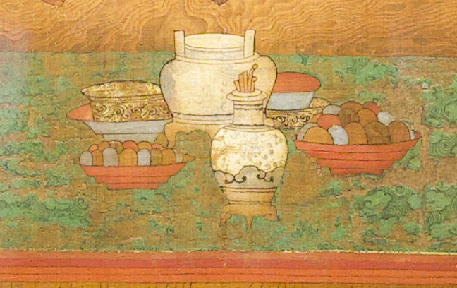 불탁 위에는 공양물이 담긴 그릇을 비롯해 향로, 병, 찻잔 등이 놓여있다.