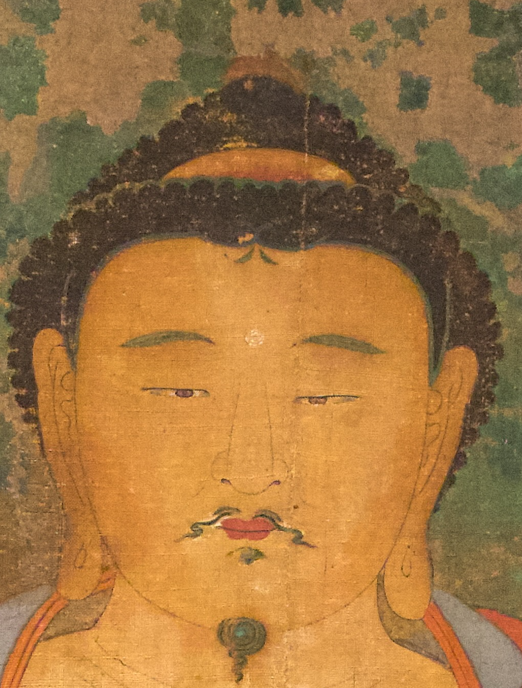 중앙 보살은 천의만 걸친 형태이며, 좌측은 청색 우측은 녹색 천의를 두르고 있다.