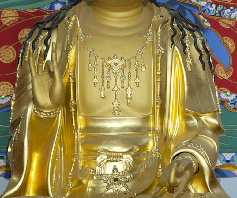 어깨 부근에서 시작된 영락은 가슴을 지나 대좌까지 길게 늘어진 군의 자락 위로 화려하게 표현되어 있으며,
