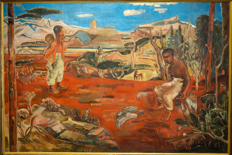 이국적인 풍경을 만들어내며, 분위기가 고갱의 타히티 연작을 연상시킨다.