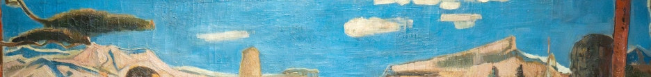 화면 대다수를 차지하고 있는 적토색은 청색의 하늘과 강한 색채 대비를 이루며