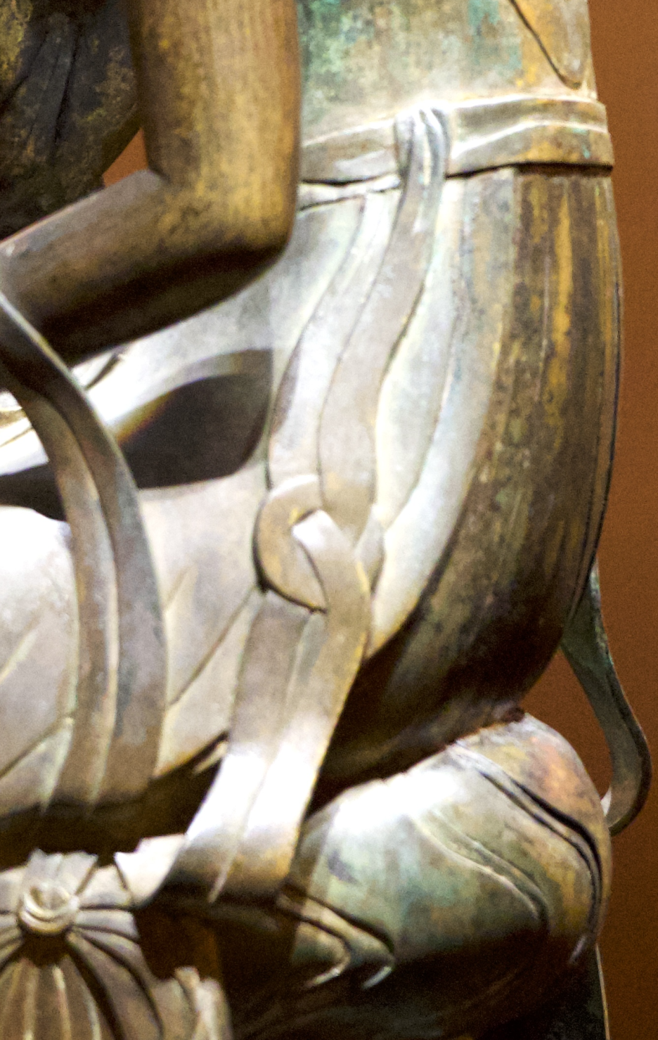하체는 두꺼운 군의를 입고 있으며, 자연스럽게 아래로 흘러내려 곡선을 이루고