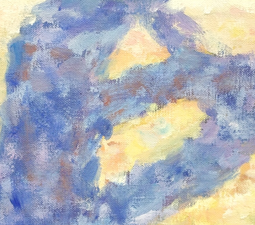 고목의 그림자에는 청색과 보라색, 돌담에는 노란색 주황색 빨간색을 짧은 붓 터치를 활용해 중첩했다.