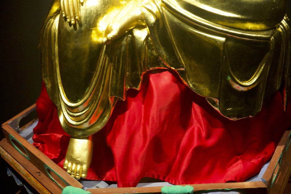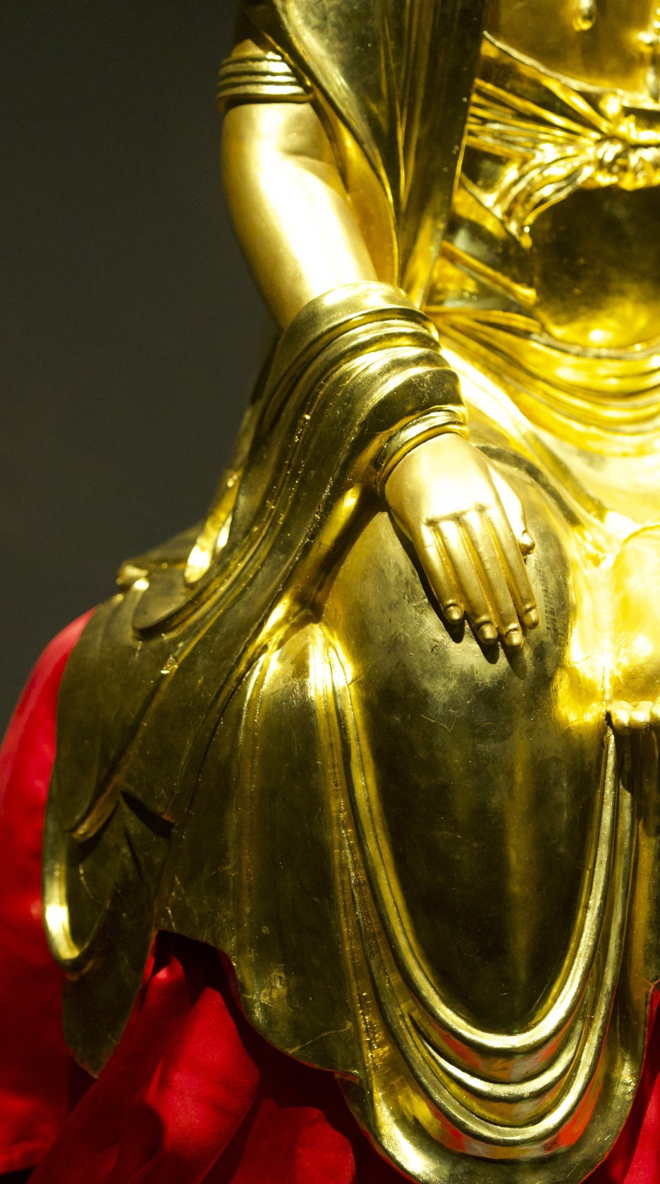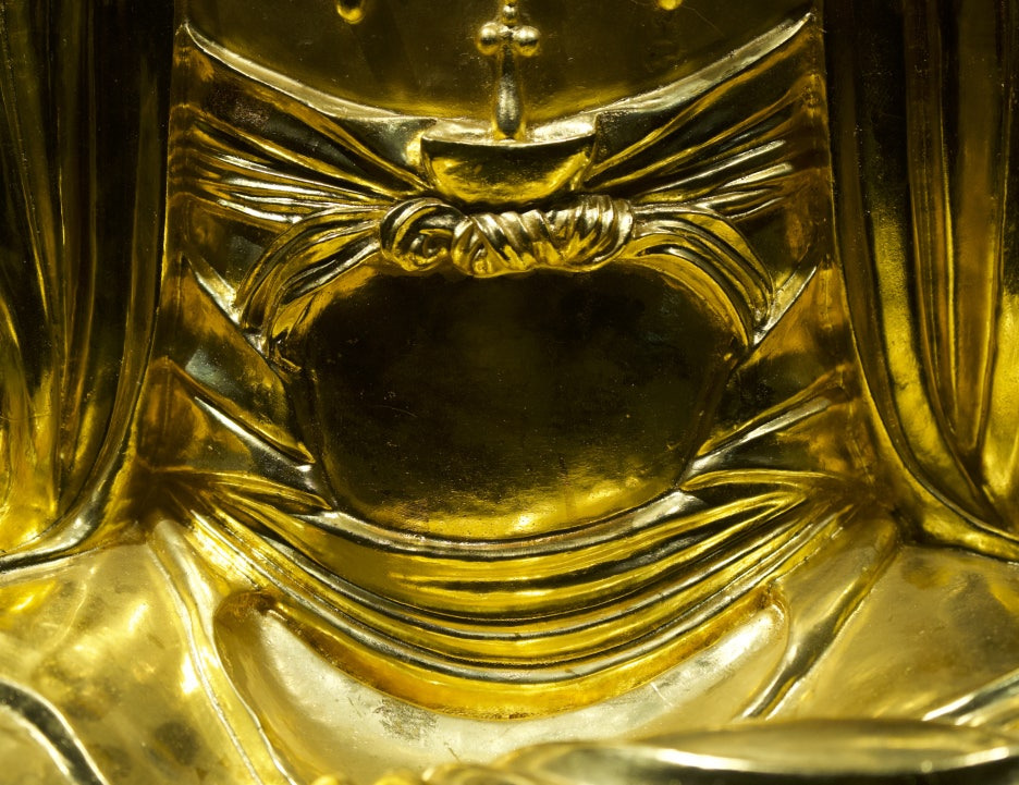 복부 양옆은 요포로 덮여 있고, 군은 대좌까지 흘러 내려와 자연스러운 주름을 형성하고 있다.