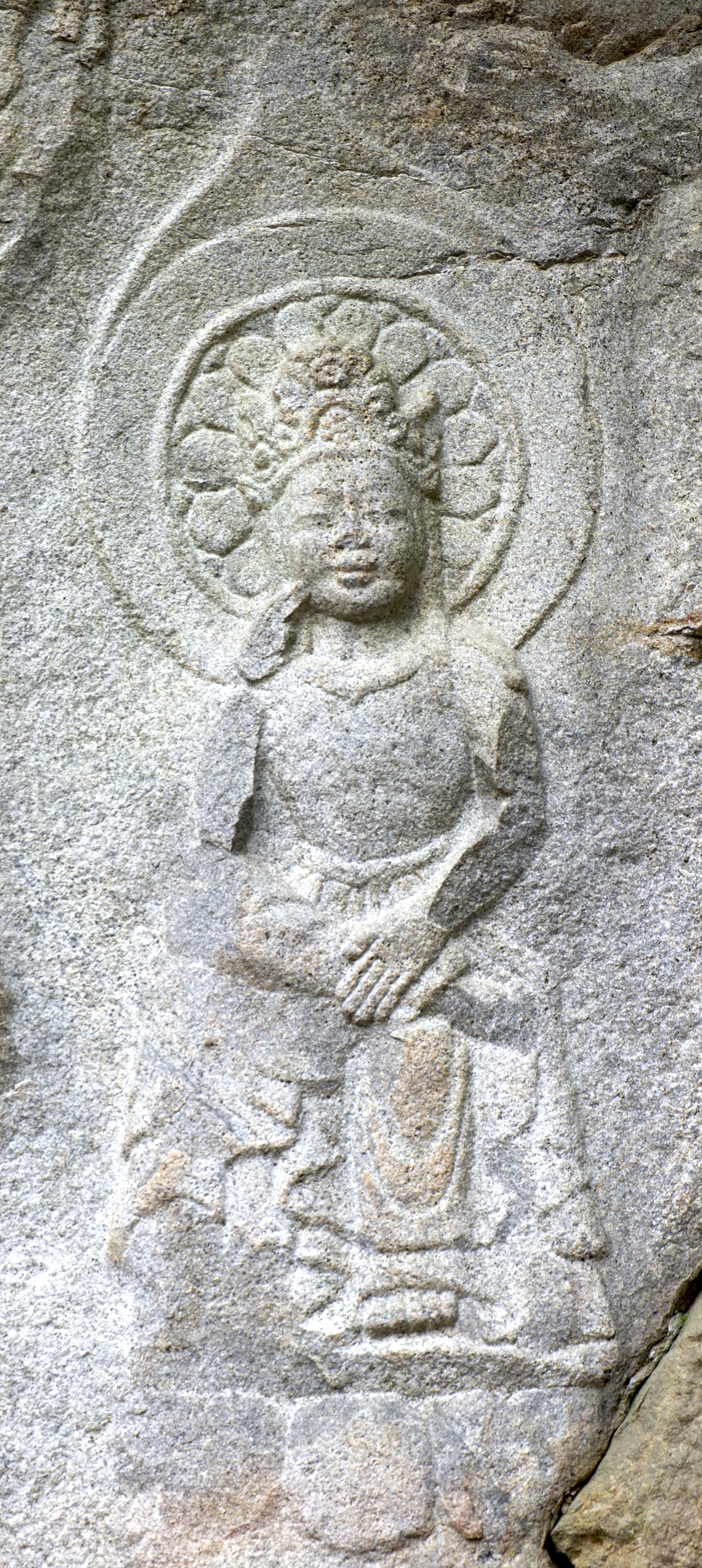 우측 보살상 역시 좌측과 동일하게 나형 상체에 짧은 목걸이를 두르고 있다.