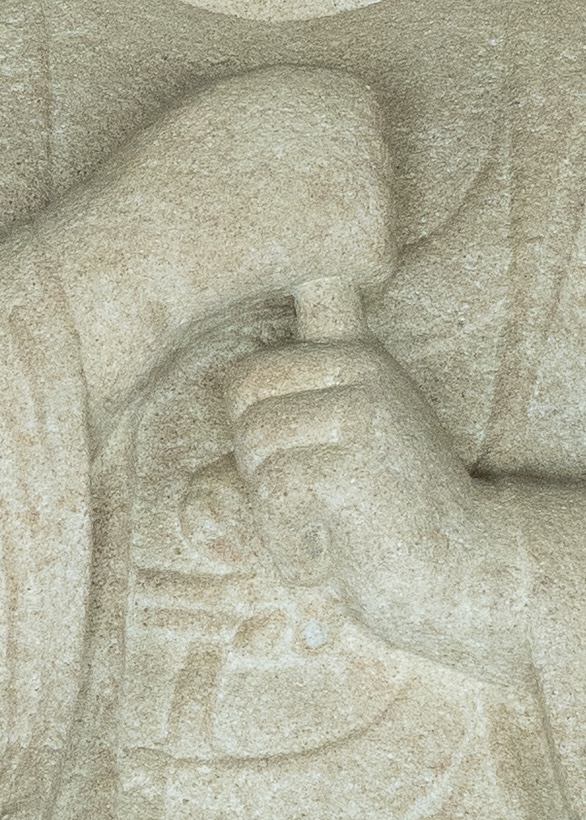 무릎 전면에도 상체와 통일감을 주는 지그재그형 옷주름이 새겨져 있다.