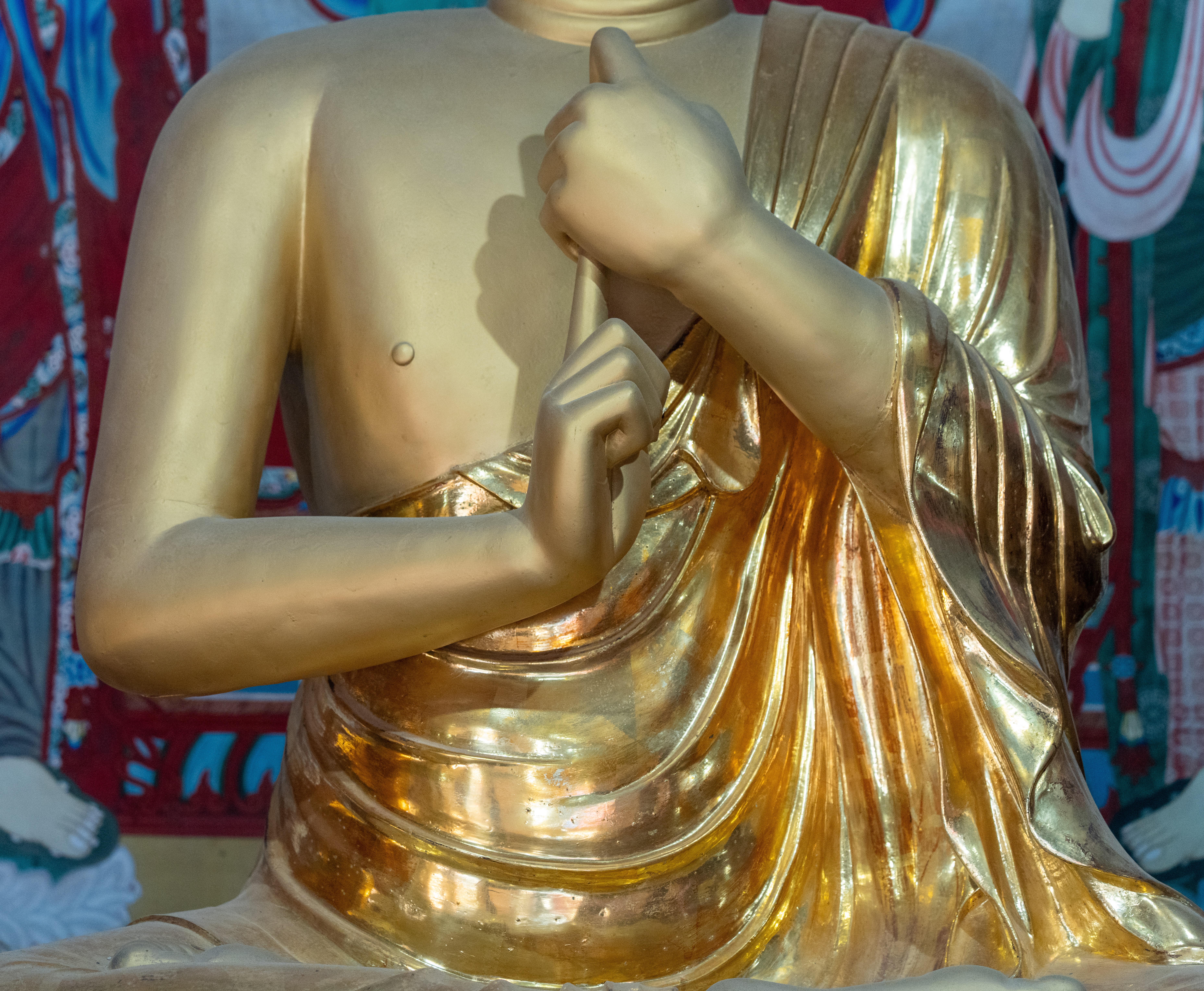 하체는 오른발이 앞쪽으로 나온 결가부좌 방식이다.