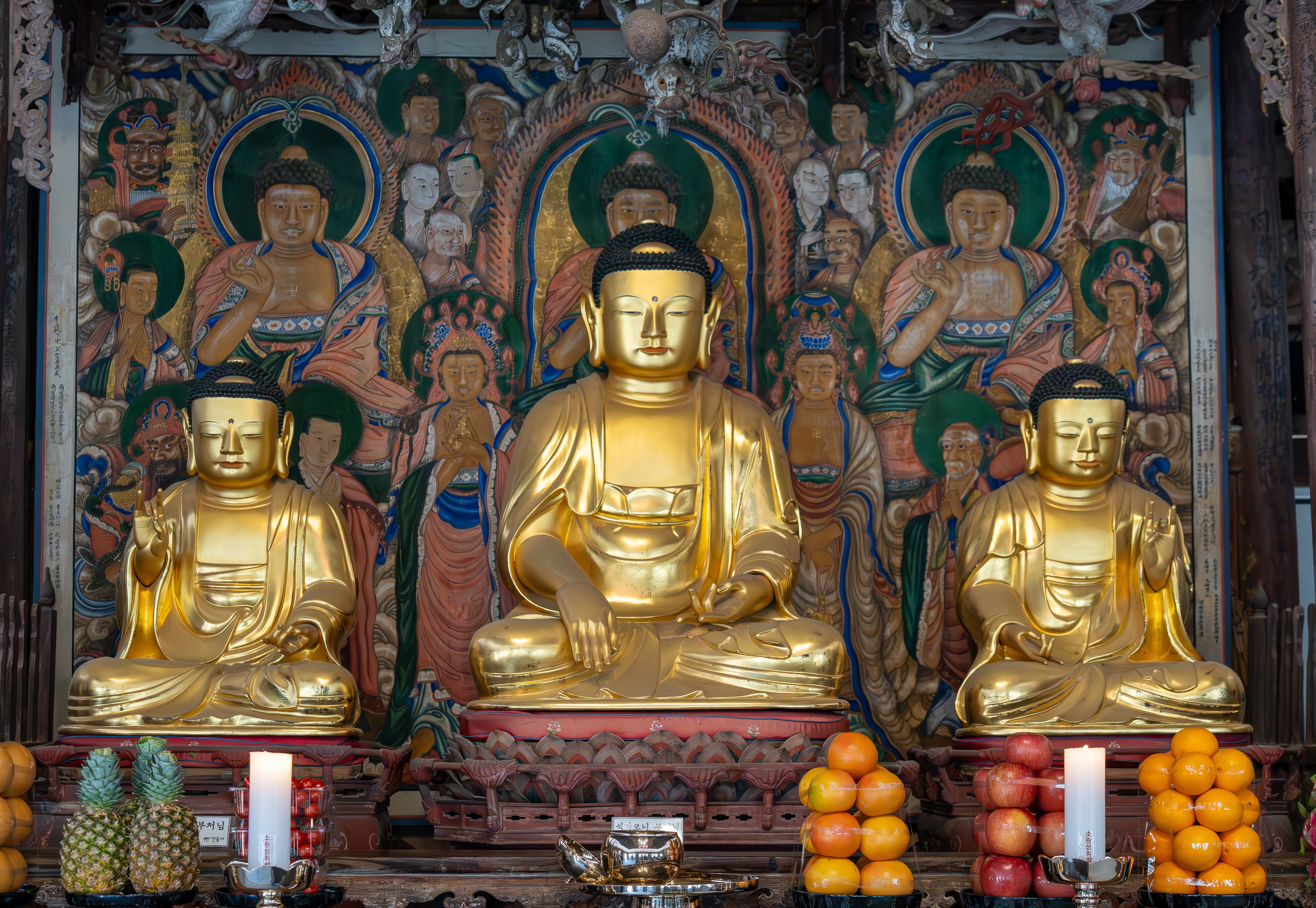 대웅전에 안치된 목조 석가여래 삼존상이다.